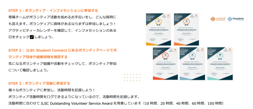 ILSCでは、学生が参加したボランティアの時間数を追跡し、ボランティア活動の節目ごとに優秀な学生に表彰を行っています。