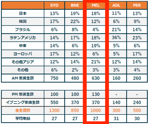 国籍ミックスは入学時期やクラスによって変わりますが、2025年11月時点の学校全体の国籍率は以下となります。(赤枠がメルボルンキャンパスです)