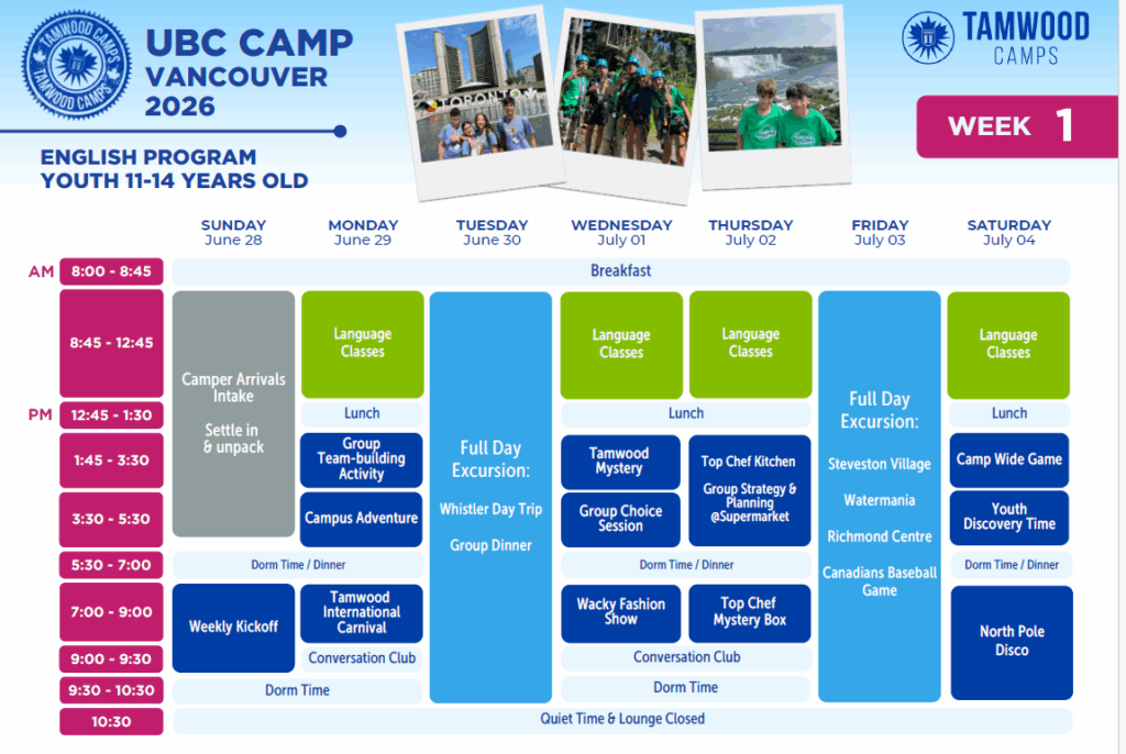本プログラムは、カナダの語学学校Tamwood(タムウッド)が毎年6月〜8月にかけて提供している、11〜17歳を対象とした短期ジュニア留学プログラムです。年齢別に11〜14歳/15〜17歳の2グループに分かれ、英語学習はもちろん、国際交流・アクティビティ・大学キャンパス滞在など、夏休みだからこそ体験できる充実した内容が特徴です。