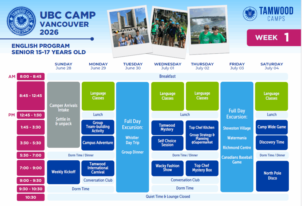 タムウッドのサマーキャンプでは、経験豊かでフレンドリーなキャンプカウンセラー(日本人カウンセラーもいます)が子供達のケアをし、英語講師資格をもった講師陣が質の高い英語の授業を提供し、毎日アクティビティへ出掛け、バンクーバーの主な観光地へ遠足へ出掛けます。