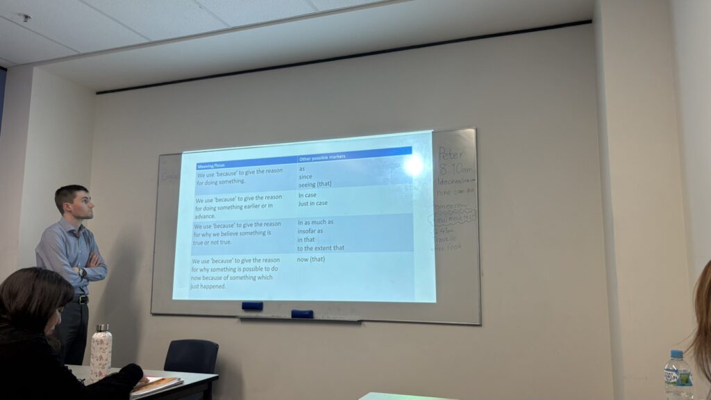 TOEIC Plusコースのクラスは、想像以上に国際色豊かな環境でした。クラスメイトの国籍は、日本、台湾、韓国、コロンビア、フランス、モンゴルなど多岐にわたり、さまざまなバックグラウンドを持つ学生が同じクラスで学んでいました。クラスの人数はおよそ15名程度で、そのうち日本人は5名ほどでした。日本人の比率は決して低くはありませんが、他国籍の学生も多く、日常的に英語を使う環境が整っていたと感じています。